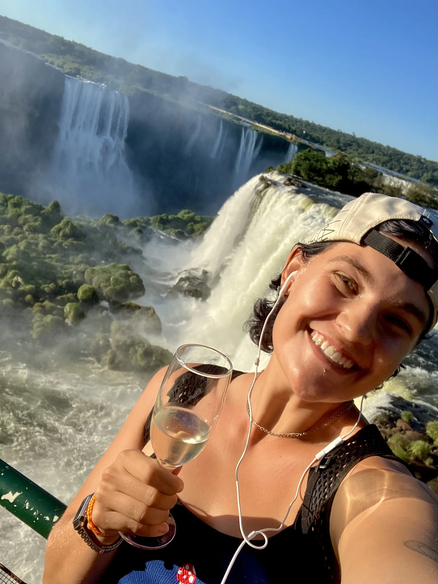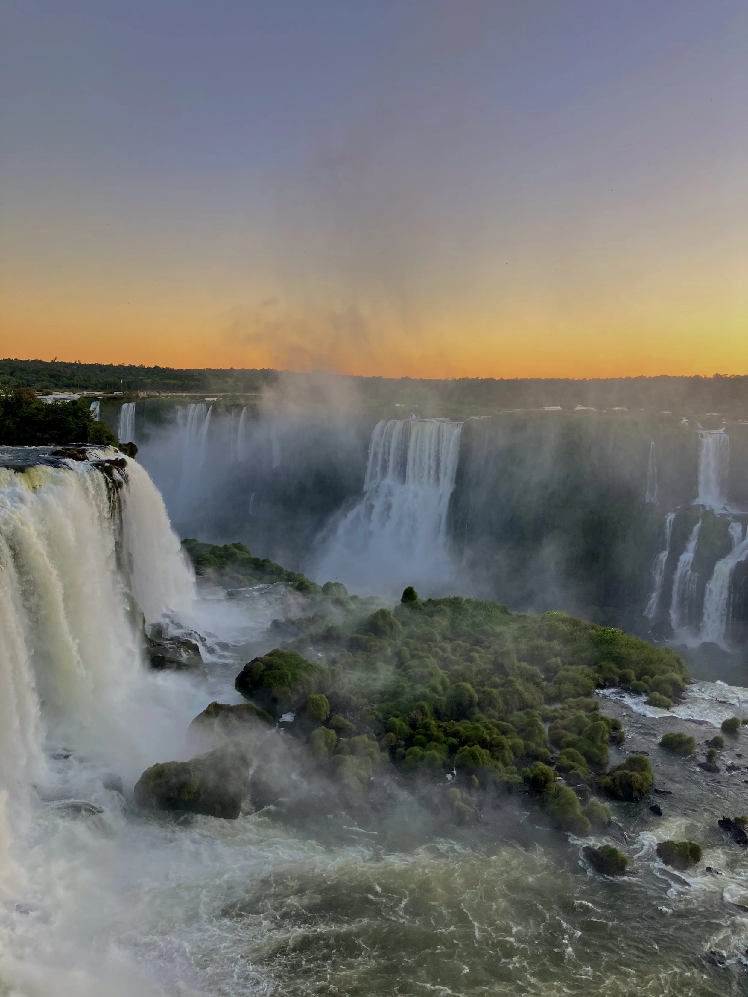Eenmaal bij het park aangekomen, kon ik met mijn speciale bandje nog naar binnen en kreeg ik meteen een gratis kokosnoot (om te drinken). Samen met anderen die ook dit speciale kaartje hadden, liepen we naar de vallen en ja, dit was gewoon weer indrukwekkend. Je had 1,5 uur voordat de zon onderging dus ik besloot om eerst naar beneden te gaan, dan sta je onderaan de watervallen en word je nat, zodat ik daarna boven kon opdrogen. Na mijn kokosnoot kreeg ik meteen een glas wijn aangeboden en met mijn glas wijn ging ik dus naar beneden. En ik heb dus weer een controversiële mening, maar ik vond dus de Braziliaanse kant vetter. Want hier stond je echt ín de watervallen waarbij je ze aan de Argentijnse kant alleen op een afstand zag. Het was inderdaad wel een stuk kleiner aan deze kant, maar wat je zag, was echt heel gaaf. Hier was je dan ook binnen een half uurtje klaar met lopen. Na dit half uur ging ik weer naar boven en toen ik boven aankwam werd meteen mijn glas weer bijgeschonken (echt door jongens in een soort butler outfits). Ik voelde me erg elite. Ik zocht een plekje uit om vanaf daar de zonsondergang te bekijken en dit was gewoon echt prachtig! Geen andere woorden voor. Een uur lang heb ik daar gestaan tot de zon onderging en mijn glas werd continu bijgeschonken en ik was echt aan het genieten.