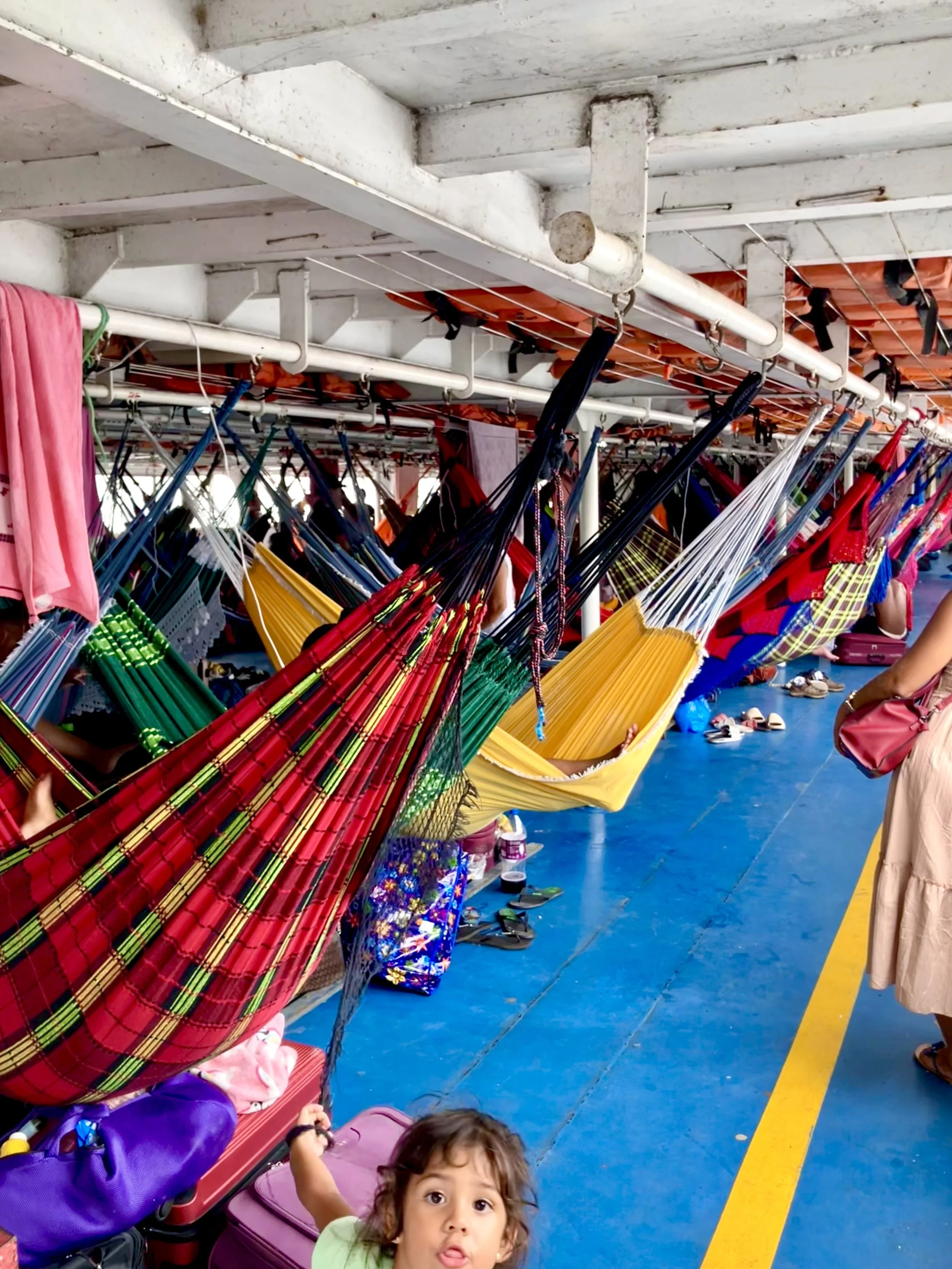 Oh my god!! Met gezonde spanning vertrok ik in de ochtend van mijn hostel naar de haven. Het was ongeveer een kwartier lopen. De boot zou om 10:00 vertrekken, maar ik moest er al om 08:00 zijn. Dus met mijn goede gedrag was ik bij de haven om 08:00. Er vertrokken veel boten dus het was ook erg druk. Ik wist ook zeker niet welke boot ik moest nemen dus dat heb ik toen maar even gevraagd (in gebarentaal) en uiteindelijk kwam ik bij de juiste boot aan. Er waren drie verdiepingen en het was de bedoeling dat je, je hangmat op de bovenste twee zou ophangen. Toen ik op de tweede verdieping aankwam, zag ik al dat het heel vol hing met hangmatten dus ging ik naar de bovenste verdieping en hier hing ik mijn hangmat helemaal in het hoekje op. En het was grappig, want de dag ervoor ben ik heel de stad afgegaan voor touw om m’n hangmat op te hangen (want zo ben ik het gewend). Dus met touw en hangmat stapte ik op de boot, maar natuurlijk was de boot zo ingericht op hangmatten dat je geen touw nodig hebt. Er waren haken in het plafond en je kon daaraan gewoon je hangmat hangen en ze waren dicht bij elkaar dus je had geen verlengstuk nodig (waarvoor je het touw zou gebruiken). Dus helaas veel tijd en geld verspilt aan touw; voor niks. Dus om kwart over 8 hing m’n hangmat en toen moest ik wachten tot 10:00… Met de minuut ging ik me afvragen waarom ik er zo vroeg van te voren moest zijn, maar ik heb maar gewoon genoten van alle mensen die op de boot kwamen. Mensen kijken, is toch een van m’n favoriete bezigheden. Dit waren ook alleen maar locals (die allemaal geen Engels spreken) dus ik was echt de enige niet-local op deze boot; wat ik eigenlijk heel leuk vond en ook één van de redenen was waarom ik dit wilde doen (zien hoe de locals het doen). Wat me op een gegeven moment wel ging opvallen, was dat de bovenste verdieping aardig stil bleef en dat de tweede verdieping steeds voller en voller werd. Dus toen ging ik nadenken ‘waarom wilt niemand op de bovenste verdieping?’. En toen mijn volgende gedachte ‘wil ik op de bovenste verdieping blijven of ga ik naar de tweede verdieping, maar dan ligt er links en rechts op nog geen centimeter afstand van mij een vreemde?’. Natuurlijk bleef ik op de bovenste verdieping; ik zou, wat de reden ook mocht zijn, dat niemand op de bovenste verdieping wilde maar voor lief nemen.