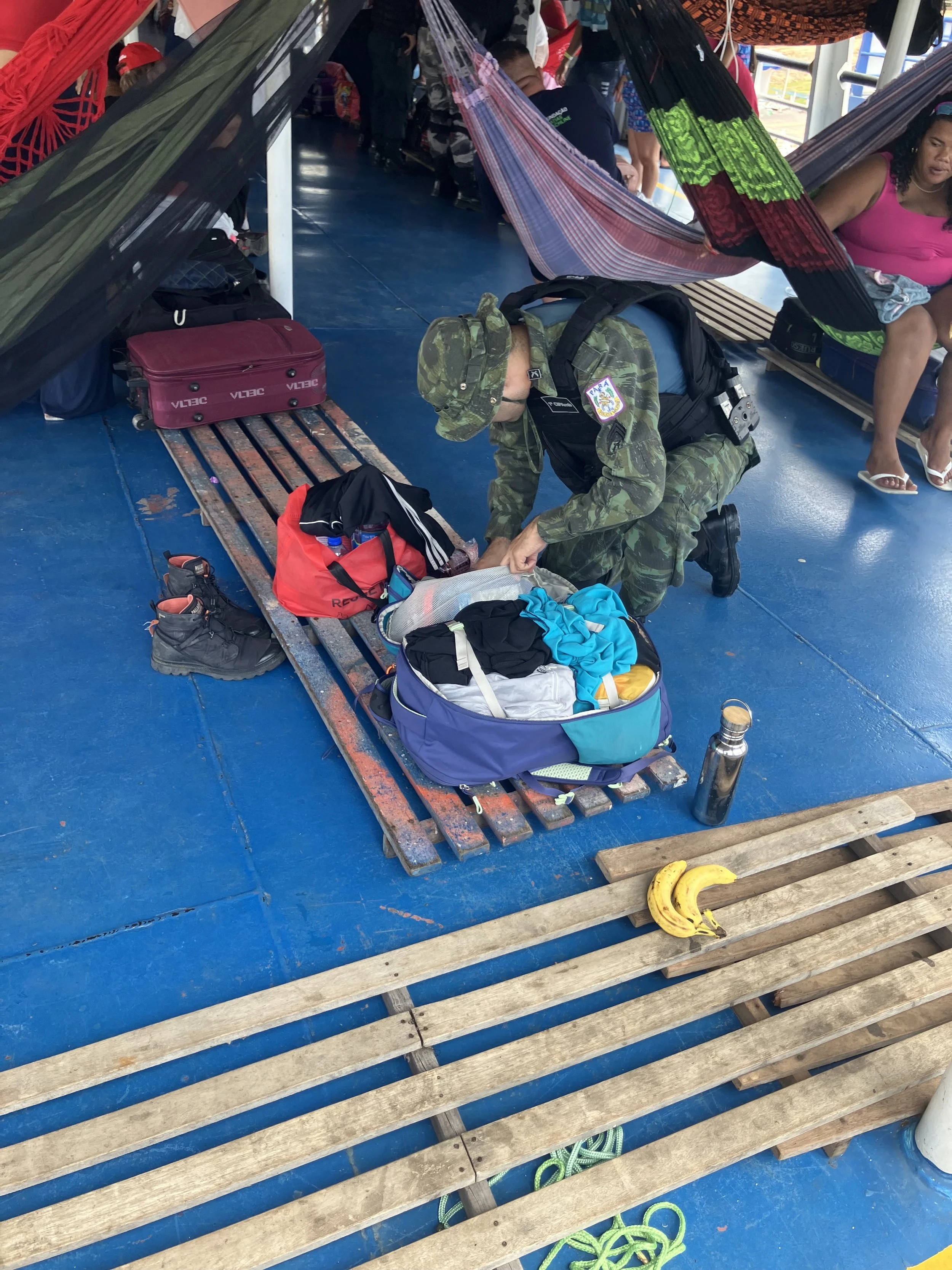 Daarnaast kwamen we natuurlijk ook langs andere dorpen langs de Amazone rivier. En bij twee van deze stopten we (sommigen stapten uit en sommigen stapten in), maar daarbij kwam ook politie aan boord. En dus tot twee keer toe werd heel die boot ondersteboven gekeerd. Iedereen moest dan ook hun tassen openmaken en ze deden een grondige zoektocht. Zo werden bijvoorbeeld mijn vitaminepillen erg onder de loep genomen. Bij mij kwam er zelfs een extra politieagent (die wel Engels kon) en zo was de één mijn tas aan het onderzoeken en de ander mij aan het overhoren. Het was weer een interessante bedoeling.