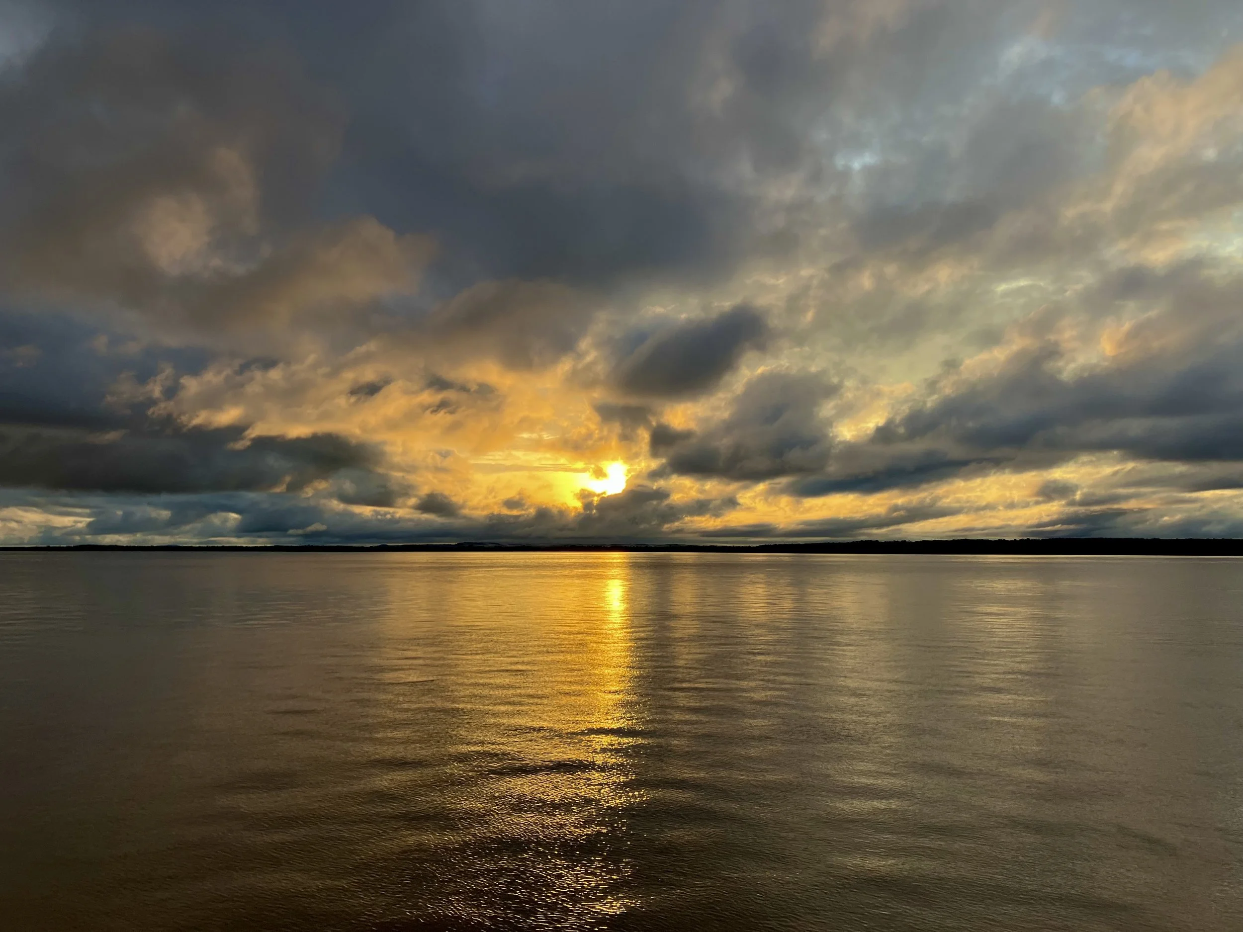 Om 10:00 vertrok uiteindelijk de boot en ja… Wat ga je dan doen? Ik ben maar in m’n hangmat gaan liggen en films gaan kijken. Ik vond het spannend om mijn tas alleen onder m’n hangmat te laten liggen (voor als ik zou gaan slapen of als ik bijvoorbeeld op het terras zou gaan zitten) dus had ik in een losse tas al m’n belangrijke spullen gedaan en deze hield ik bij mij in de hangmat of nam ik mee als ik naar een anders deel op de boot zou gaan. Na twee films te hebben gekeken, werd ik onrustig dus ben ik rondjes gaan lopen op de boot. Er was ook een soort ‘dak’ waar dan een bar was en hier kon je ook zitten. Dus toen ben ik hier gaan zitten, want de zon ging onder en dit was de ideale plek om het te zien, wat dus heel mooi was! Daar zit je dan op een boot op de Amazone rivier, met rechts van je regenwoud en links van je ook regenwoud en dan in de verte de zon die ondergaat. Prachtig. Hier heb ik erg van genoten, natuurlijk! Toen het eenmaal donker was, ben ik weer naar m’n hangmat gegaan, heb ik nog een film gekeken en toen ben ik gaan slapen. Toen merkte ik ook waarom niemand op de bovenste verdieping wilde slapen, want er stond veel wind en het was erg koud. Op de tweede verdieping was namelijk alles dicht (met ramen enzo) en op de bovenste verdieping was alles open. Ik deed m’n thermokleding + joggingkleding aan en ben toen alsnog lekker in slaap gevallen.
